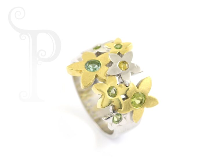 18k White and Yellow Gold Green Tourmaline and Demantoid Diasy Ring