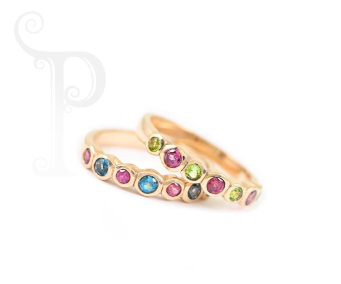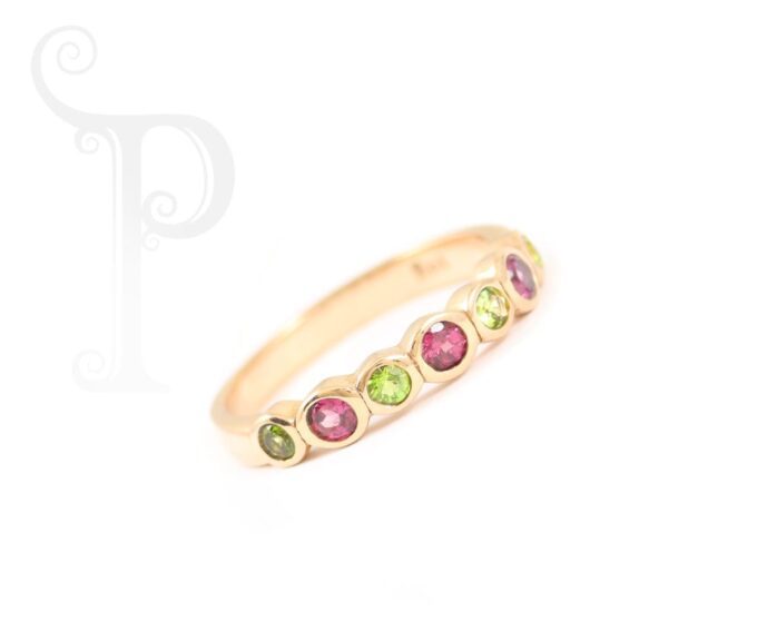 9k Rose Gold Rhodalite and Peridot Tube Set Eternity Ring