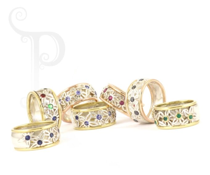 Argentium Silver and 18k Yellow or Rose Gold Daisy Rings set with Precious Stones